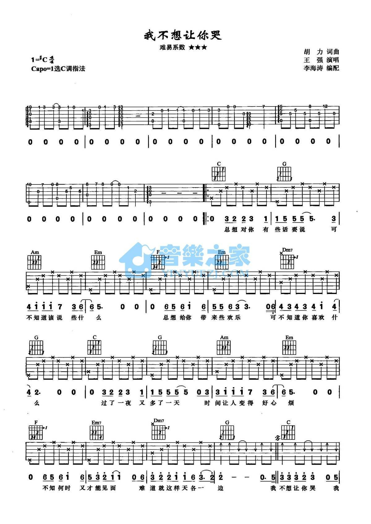 C调版王强《不想让你哭》吉他弹唱六线谱...