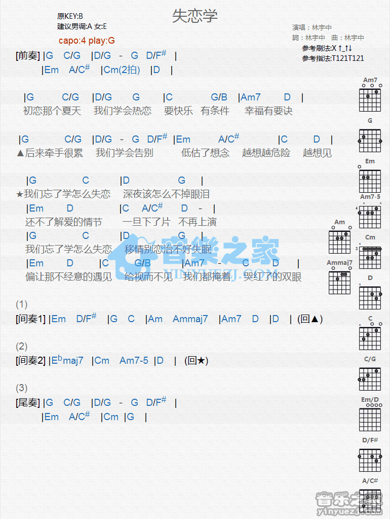 G调版林宇中《失恋学》吉他和弦弹唱谱...
