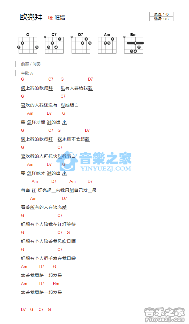 C调版旺福《欧兜拜》吉他和弦弹唱谱...