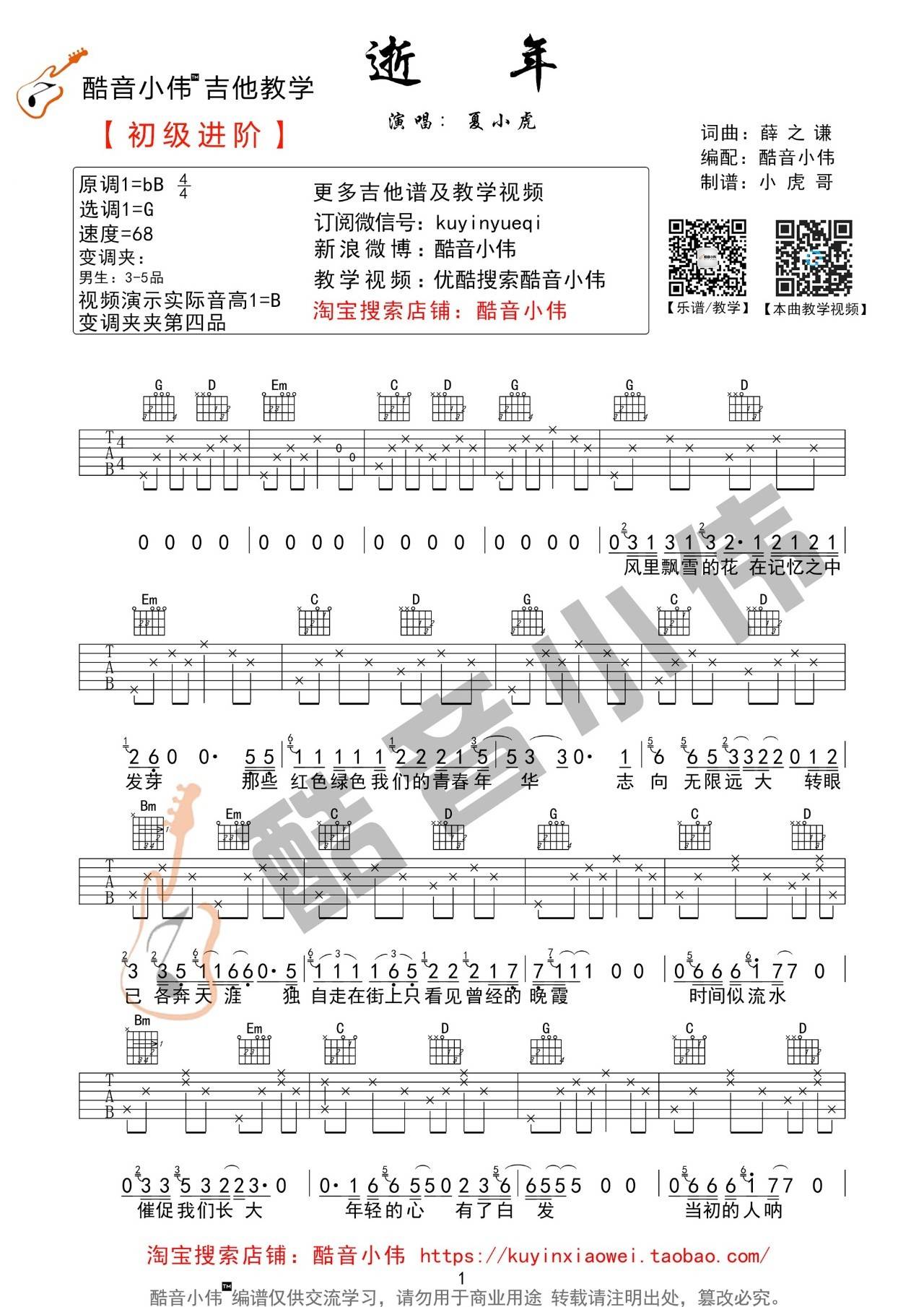 吉他夏小虎《逝年》吉他谱_吉他弹唱谱_酷音小伟编配