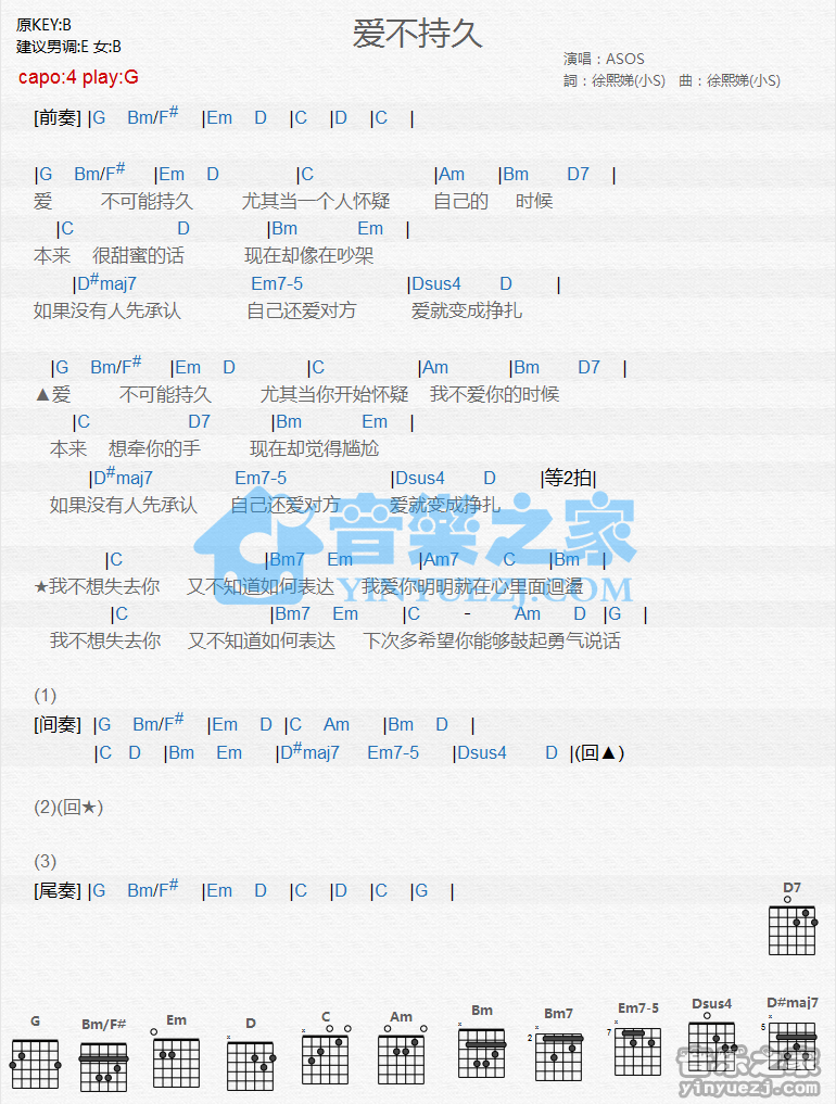 吉他ASOS《爱不持久》吉他谱_吉他弹唱谱_YYZJ编配