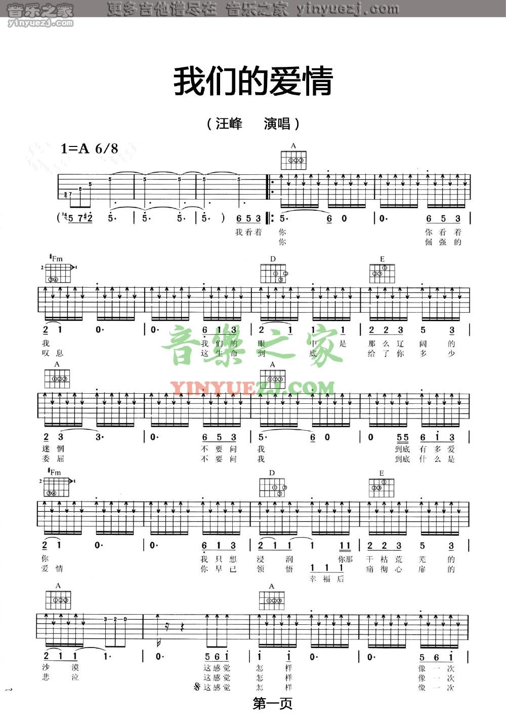 汪峰《我们的爱情》吉他谱,YYZJ编配出品,共有2张高清图谱,免翻页排版设计。...