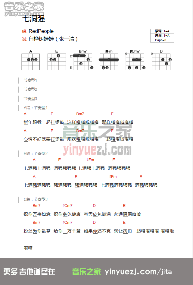 RedPeople《七洞强》吉他谱,YYZJ编配出品,共有1张高清图谱,免翻页排版设计。...