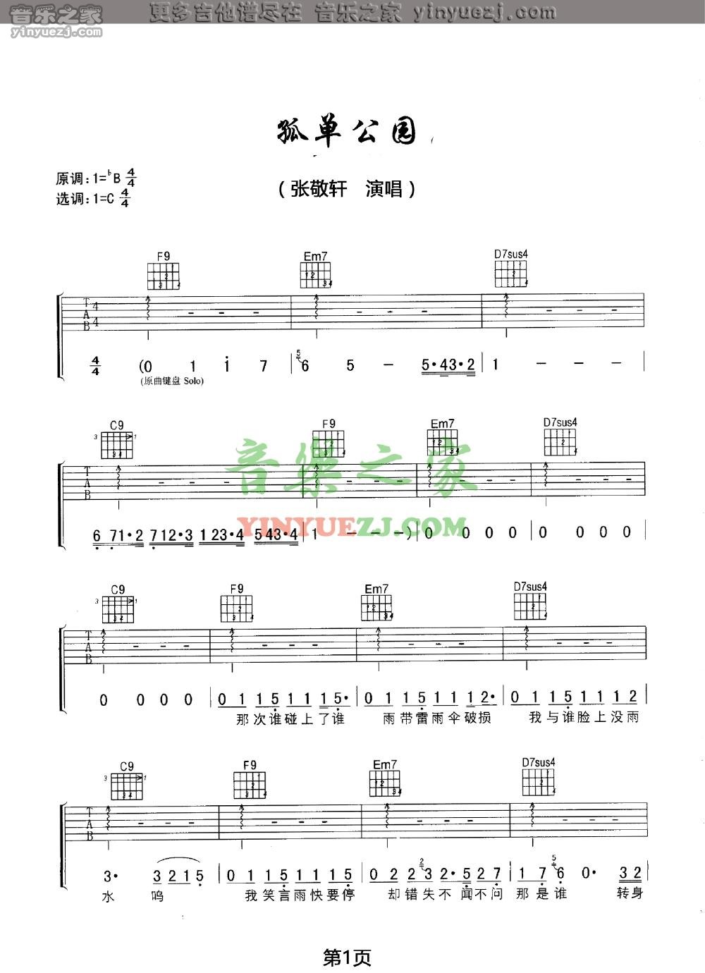 吉他张敬轩《孤单公园》吉他谱_吉他弹唱谱_YYZJ编配