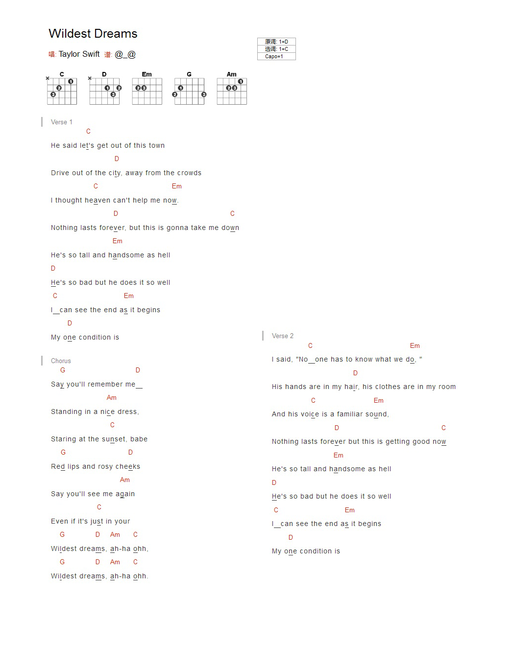 吉他TaylorSwift《Wilddest Dreams》吉他谱_吉他弹唱谱_YYZJ编配