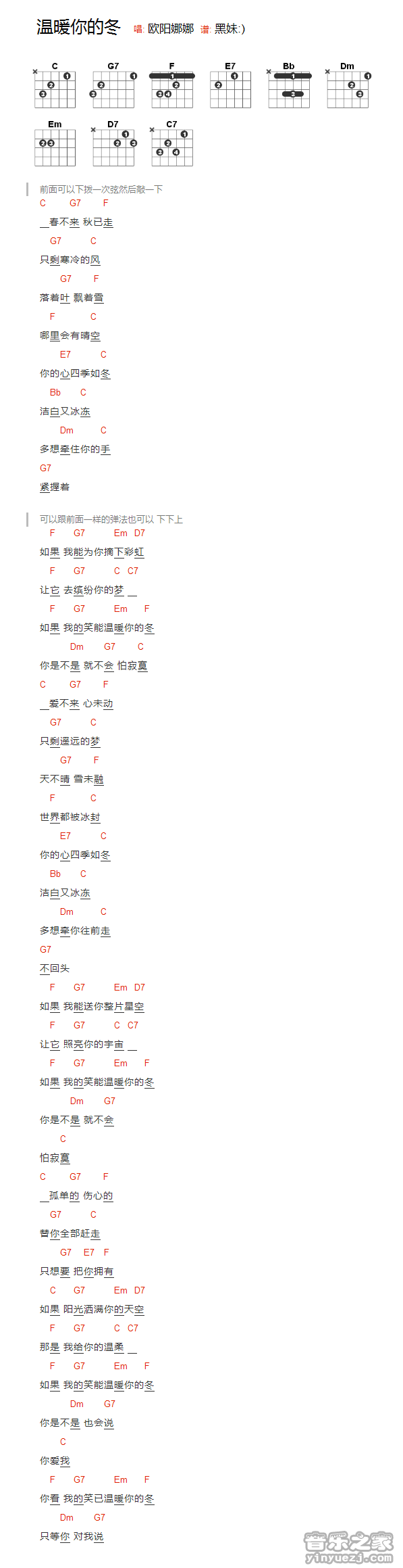 吉他欧阳娜娜《温暖你的冬》吉他谱_吉他弹唱谱_YYZJ编配