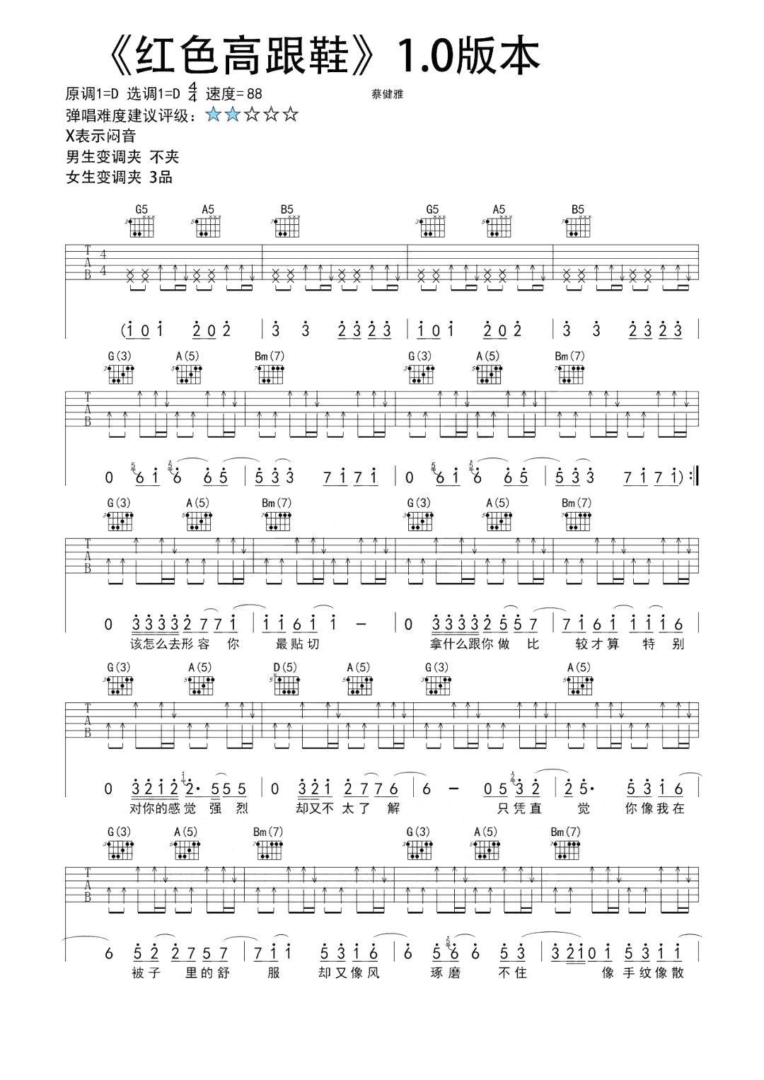 吉他蔡健雅《红色高跟鞋》吉他谱_吉他弹唱谱_孙学长吉他教室编配