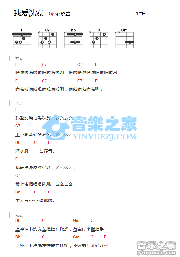 范晓萱《我爱洗澡》吉他谱,YYZJ编配出品,共有1张高清图谱,免翻页排版设计。...
