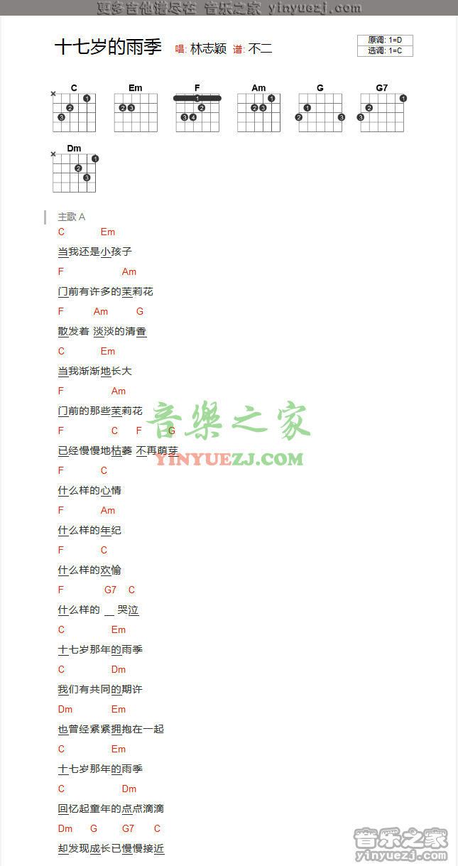 吉他林志颖《十七岁的雨季》吉他谱_吉他弹唱谱_YYZJ编配