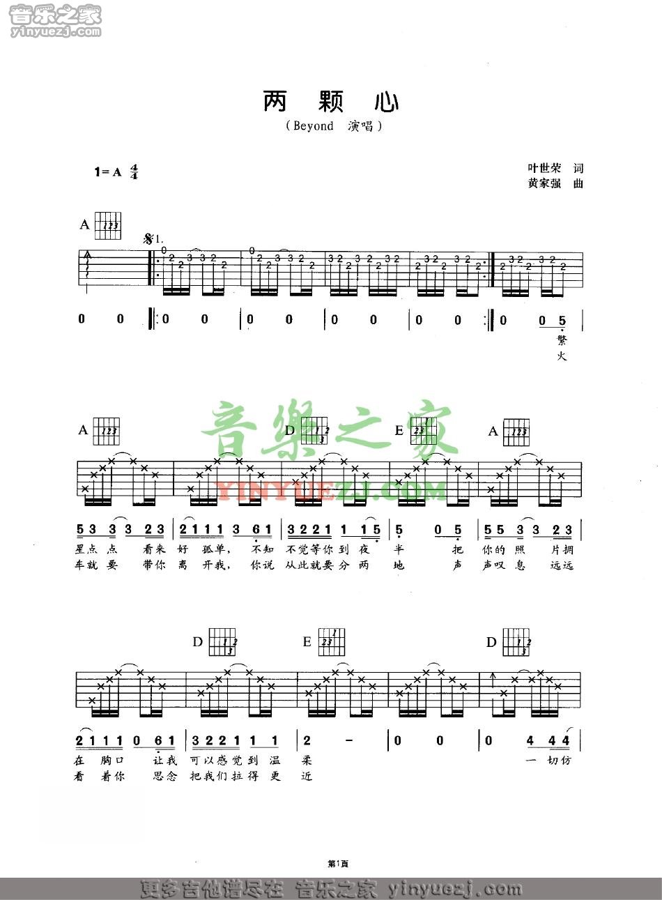 Beyond《两颗心》吉他谱,YYZJ编配出品,共有3张高清图谱。...
