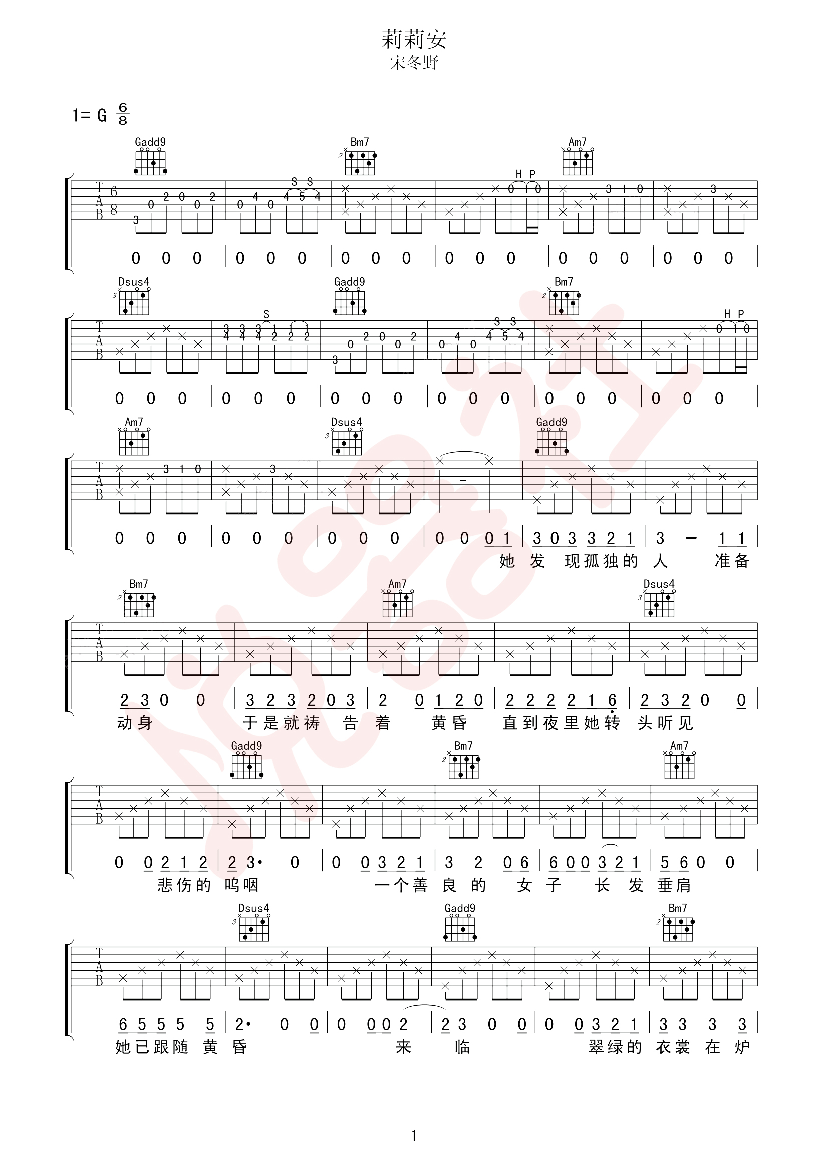 吉他宋冬野《莉莉安》吉他谱_吉他弹唱谱_悦器社编配