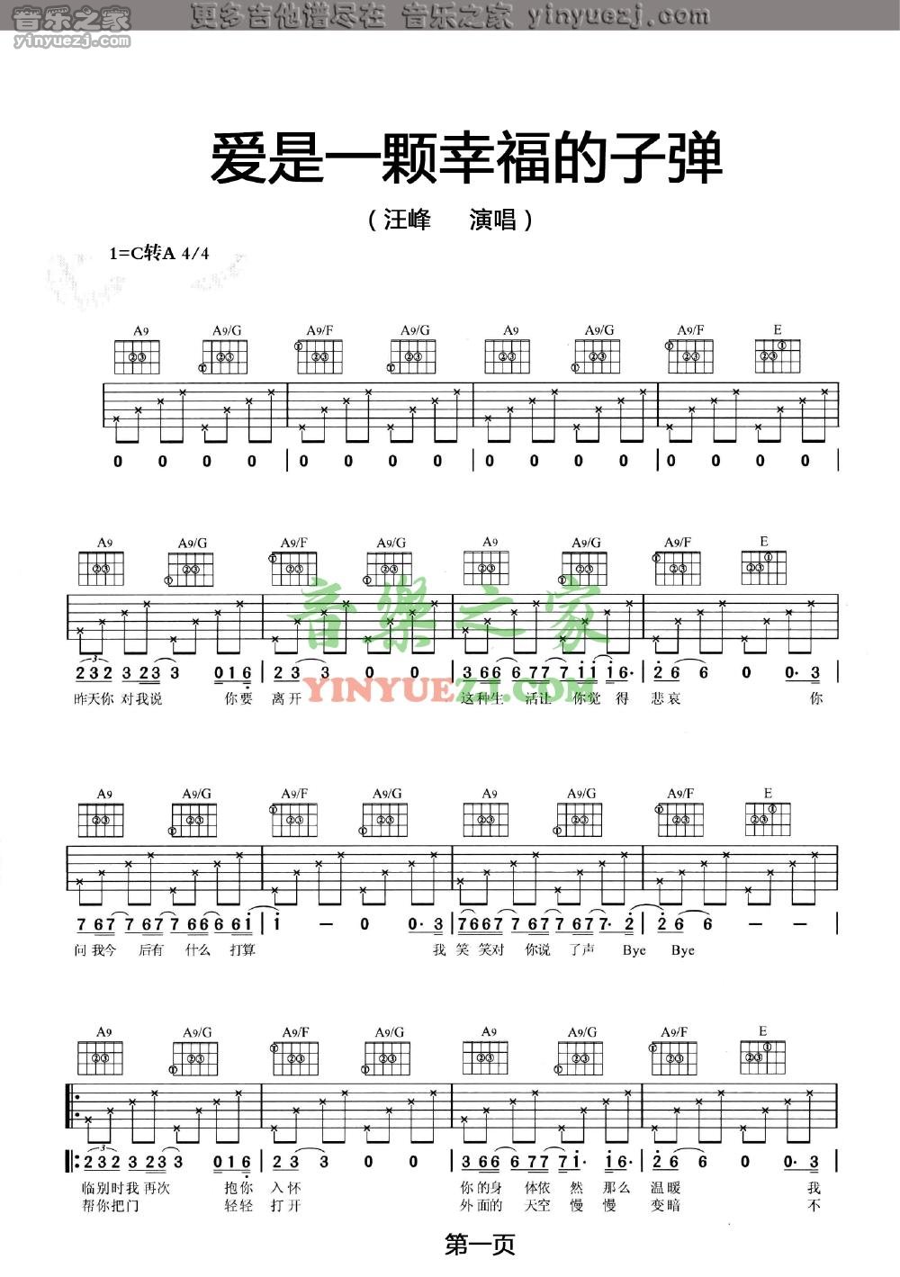 汪峰《爱是一颗幸福的子弹》吉他谱,YYZJ编配出品,共有2张高清图谱,免翻页排版设计。...