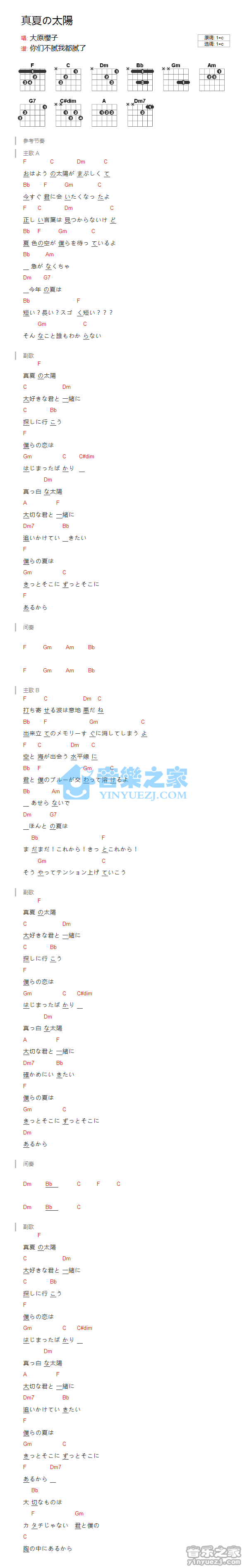 吉他大原樱子《真夏的太阳》吉他谱_吉他弹唱谱_YYZJ编配