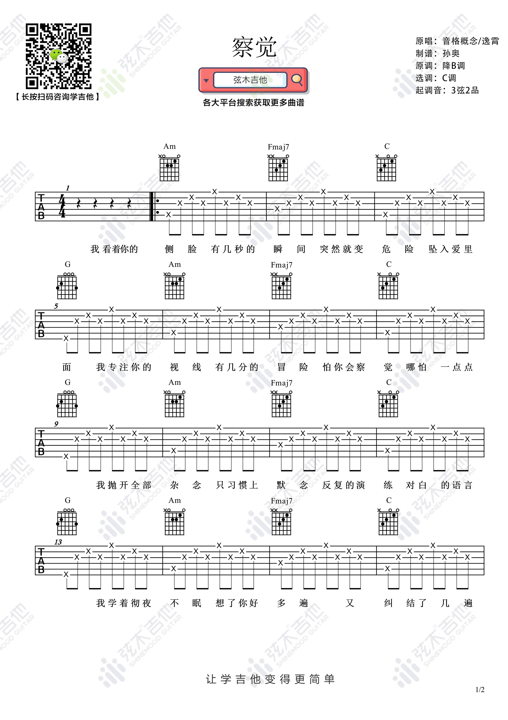 音格概念和逸霄演唱,《察觉》吉他谱,原调降B选调C,起调音三弦二品。一首关于暗恋的歌曲,爱你这件事,我怕你察觉到,又怕你察觉不到,相信很多人都会有这样的心情吧。所以,如果真爱,就请大声说出来!...