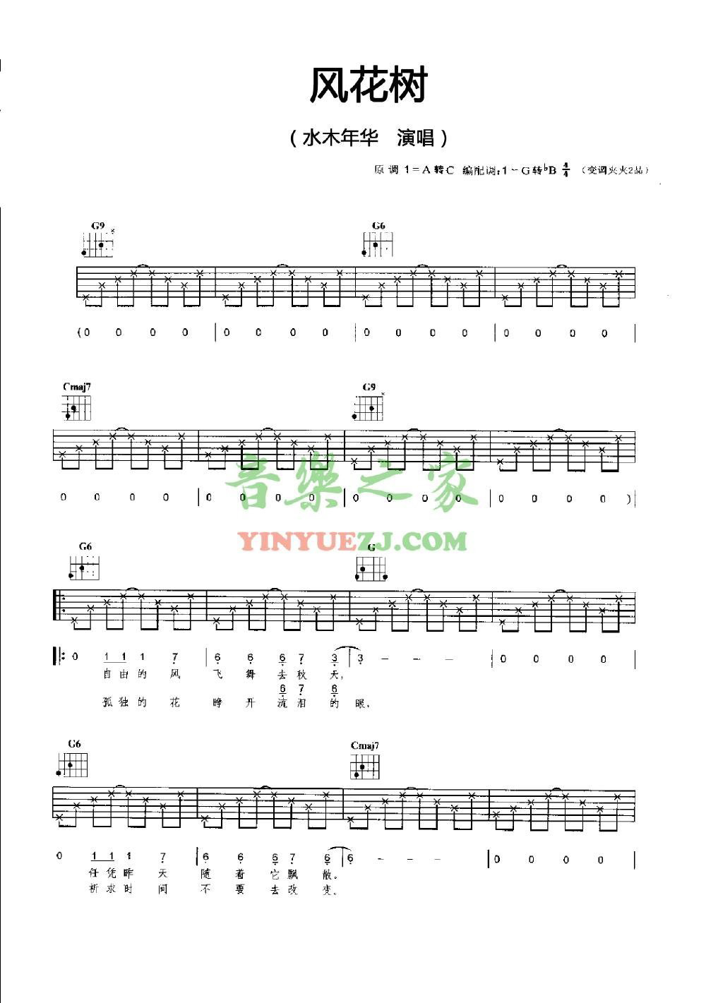 吉他水木年华《风花树》吉他谱_吉他弹唱谱_YYZJ编配