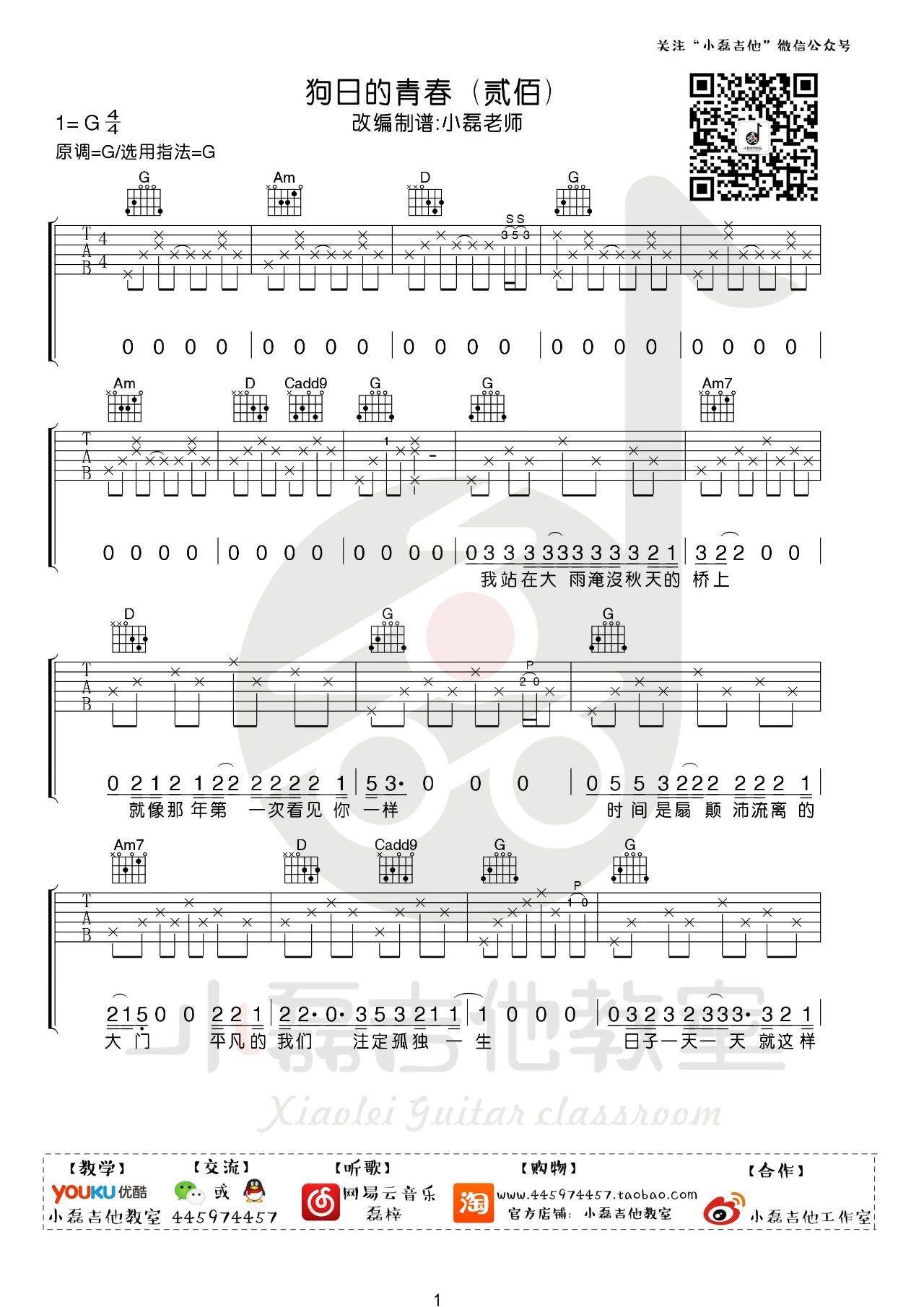 吉他贰佰《狗日的青春》吉他谱_吉他弹唱谱_小磊吉他编配