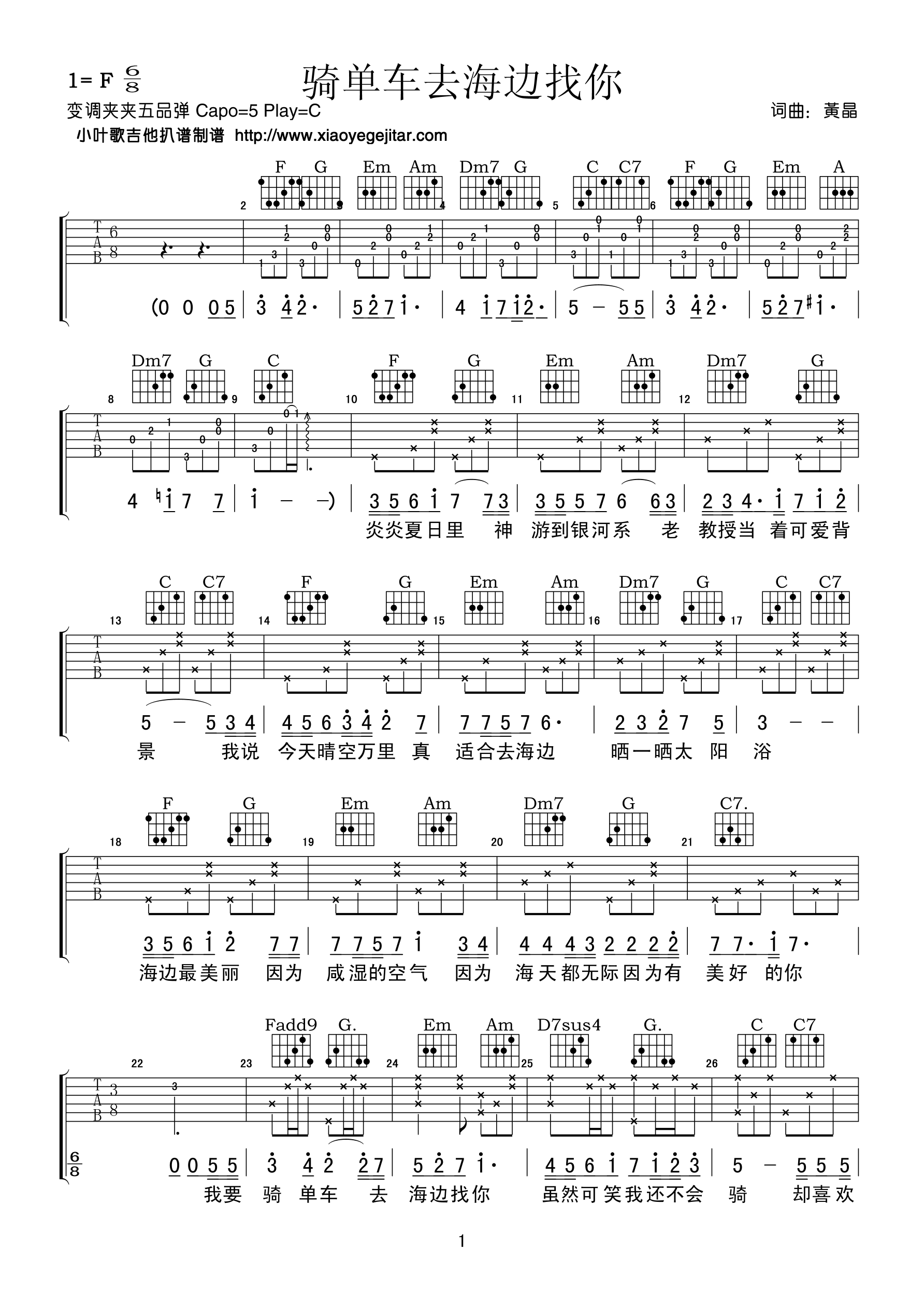 黄晶《骑单车去海边找你》吉他谱,小叶歌编配出品,共有4张高清图谱。...