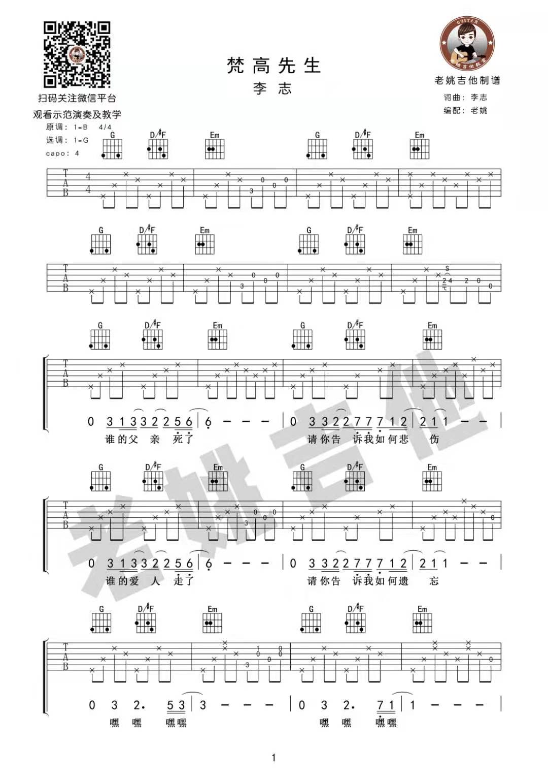吉他李志《梵高先生》吉他谱_吉他弹唱谱_老姚吉他编配