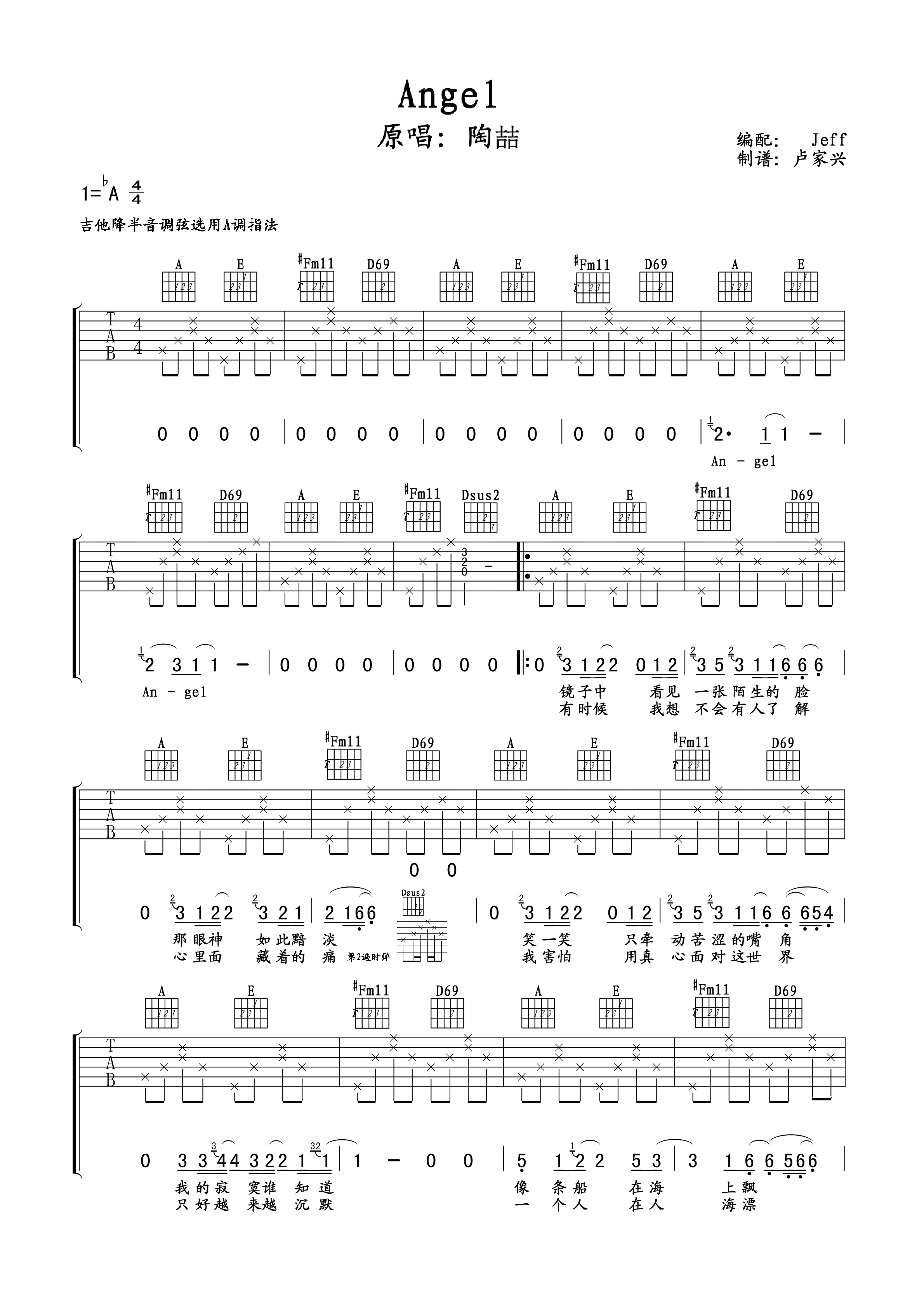 陶喆《angel》吉他谱,共有2张高清图谱,免翻页排版设计。...
