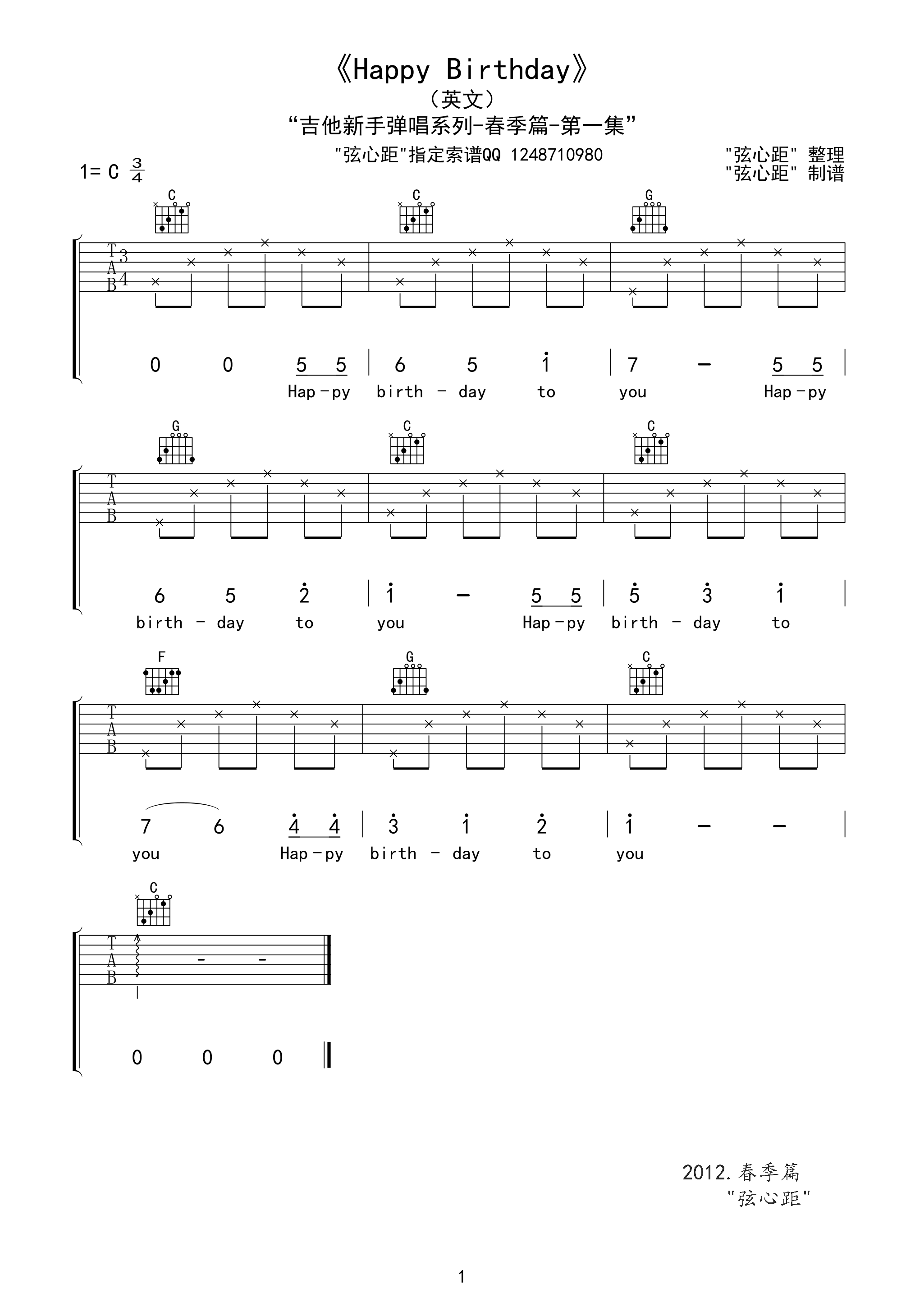 《祝你生日快乐歌》吉他谱,弦心距编配出品,共有1张高清图谱,免翻页排版设计。...