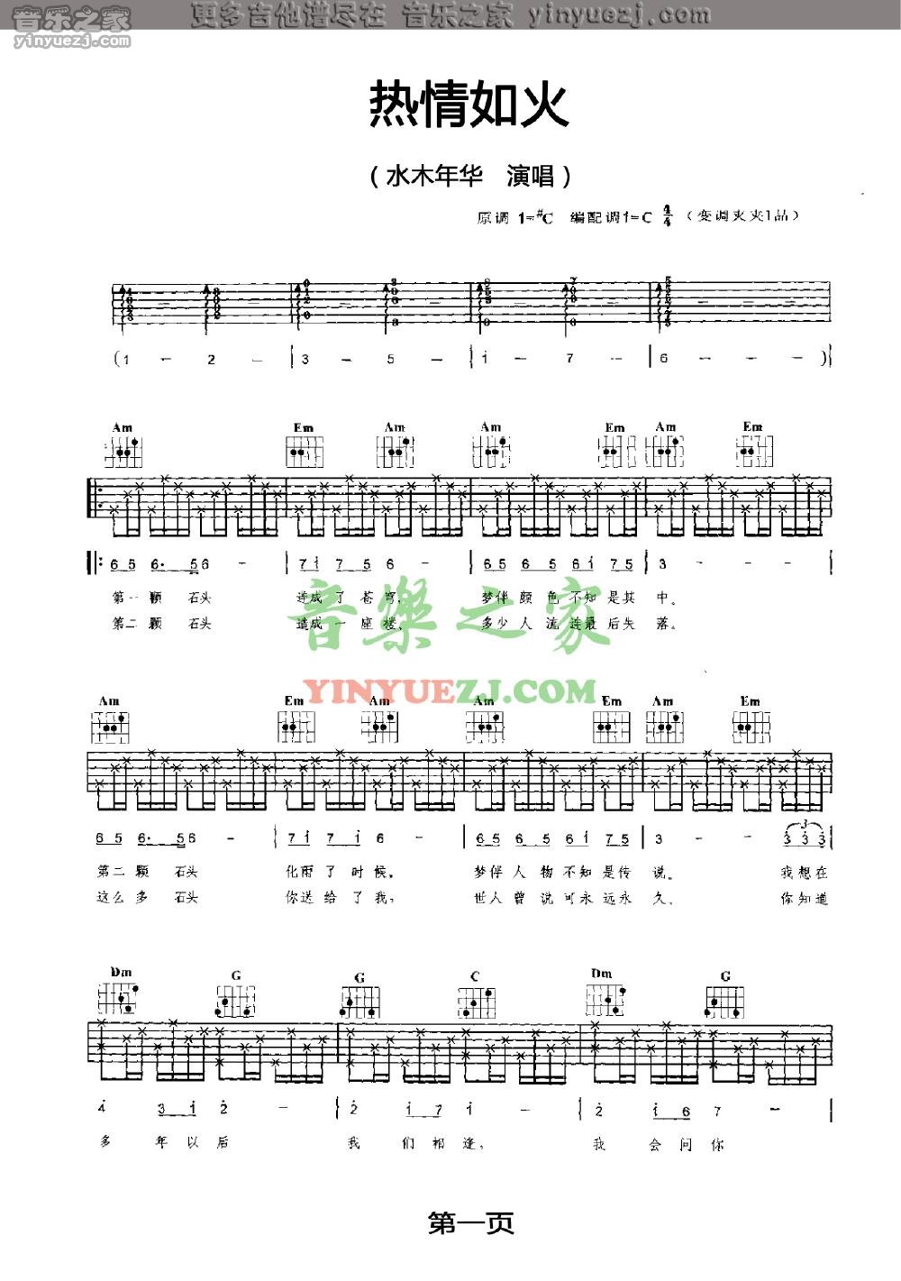 水木年华《热情如火》吉他谱,YYZJ编配出品,共有4张高清图谱。...