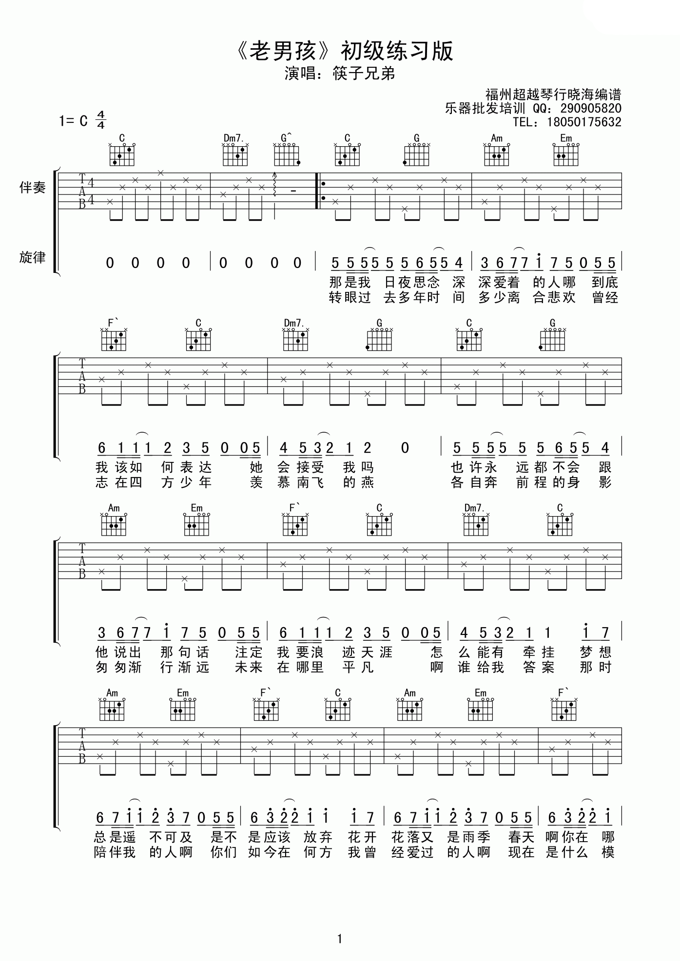 吉他筷子兄弟《老男孩》吉他谱_吉他弹唱谱_福州超越琴行编配