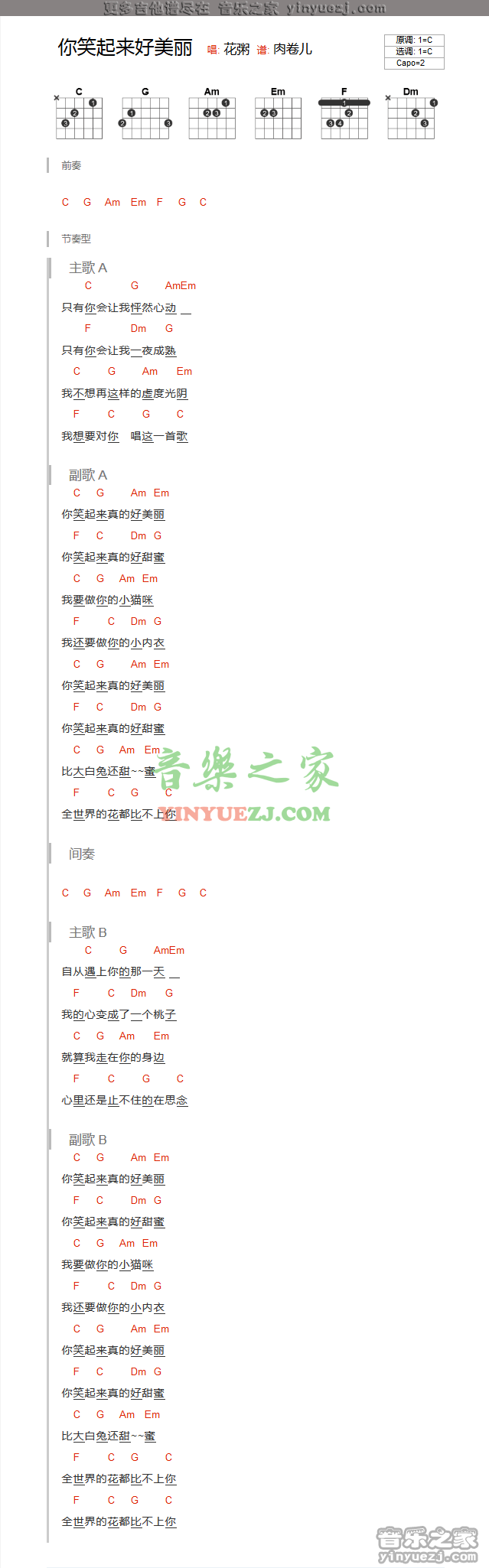 花粥《你笑起来好美丽》吉他谱,YYZJ编配出品,共有1张高清图谱,免翻页排版设计。...