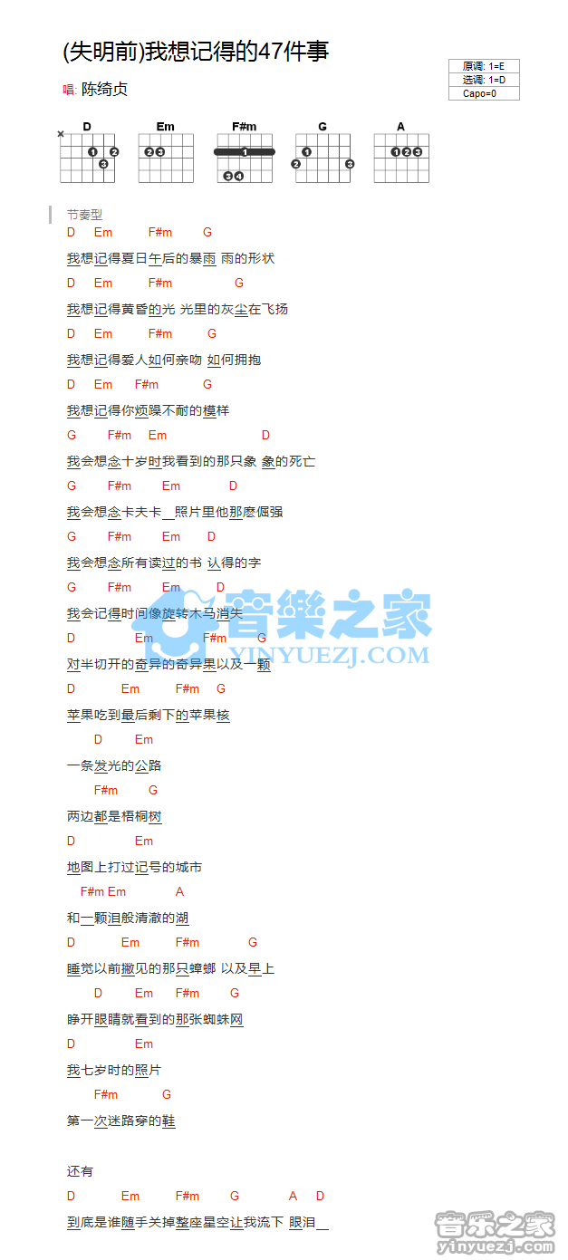 吉他陈绮贞《失明前我想记得的47件事》吉他谱_吉他弹唱谱_YYZJ编配