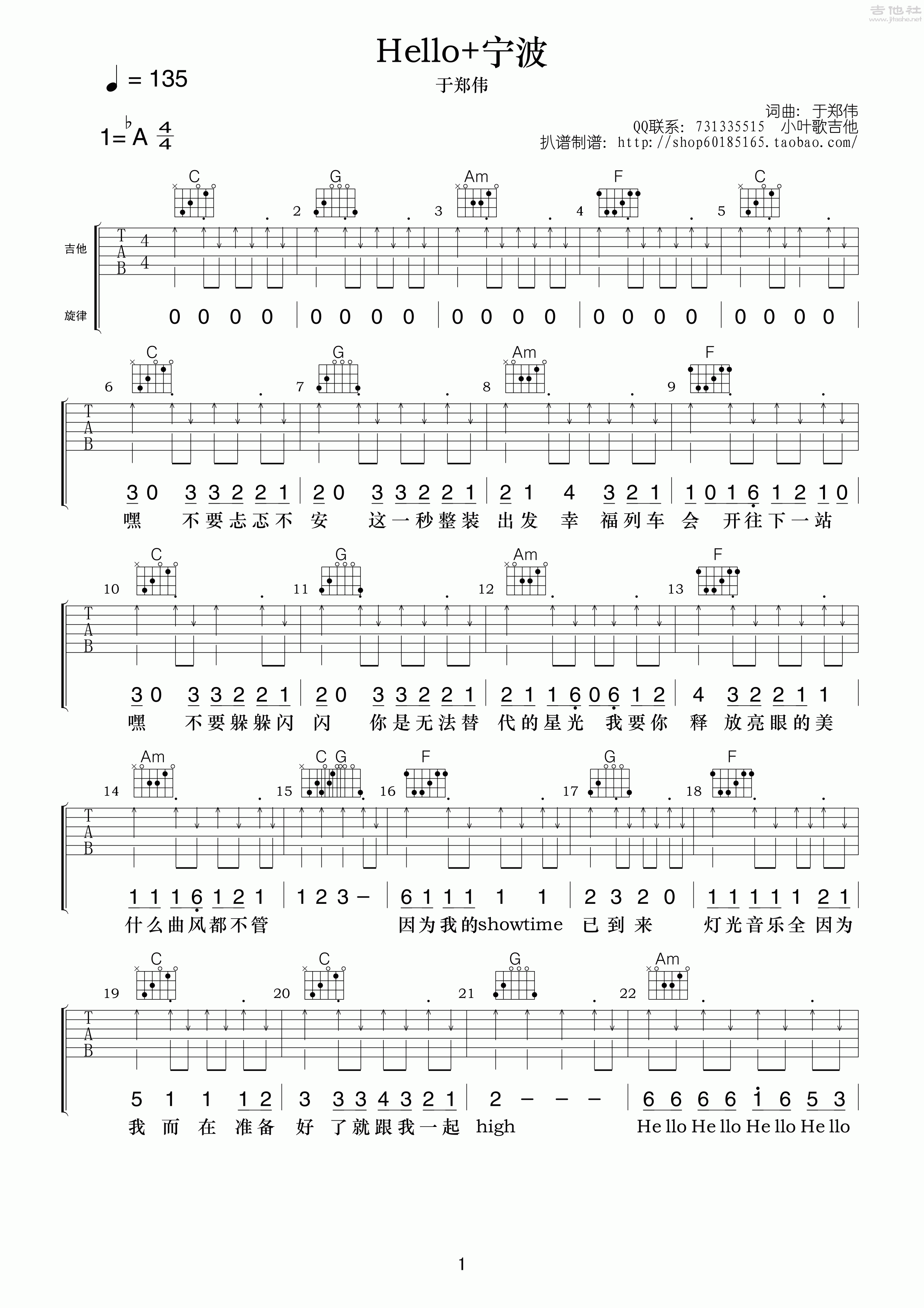 于郑伟《Hello宁波》吉他谱,小叶歌编配出品,共有5张高清图谱。...