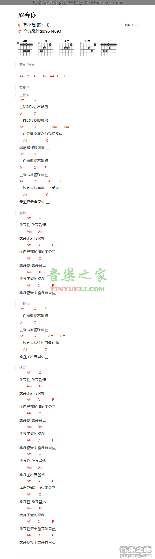 吉他郭书瑶《放弃你》吉他谱_吉他弹唱谱_YYZJ编配