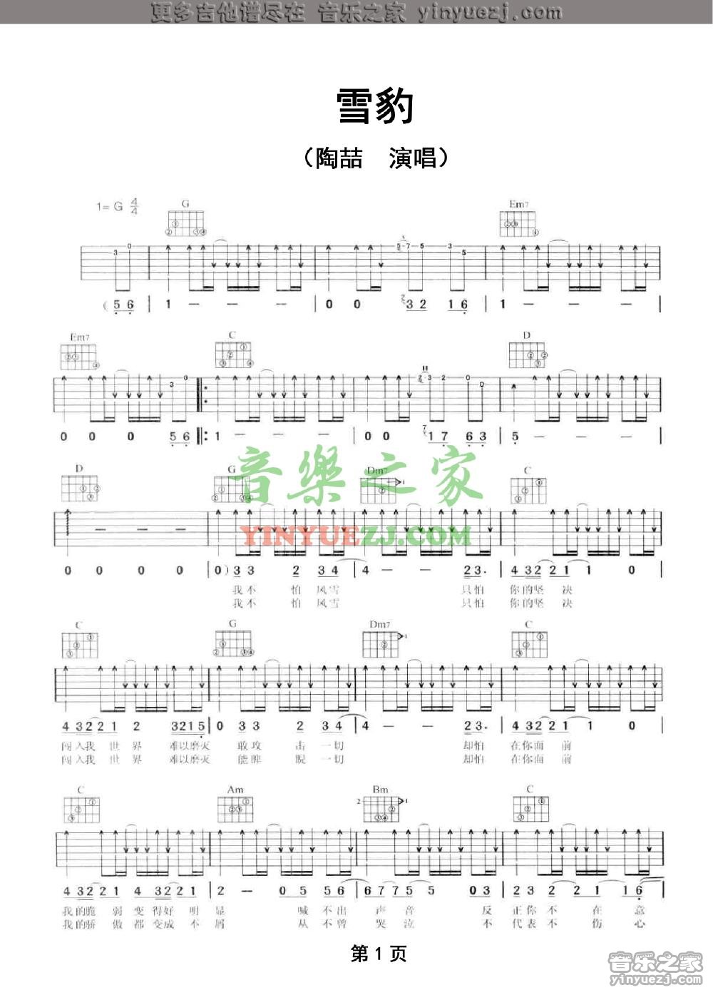 陶喆《雪豹》吉他谱,YYZJ编配出品,共有2张高清图谱,免翻页排版设计。...