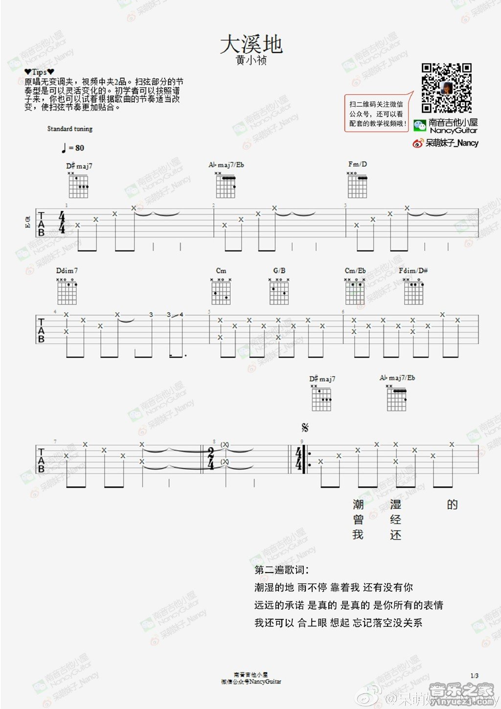 黄小桢《大溪地》吉他谱,南音吉他编配出品,共有3张高清图谱。...