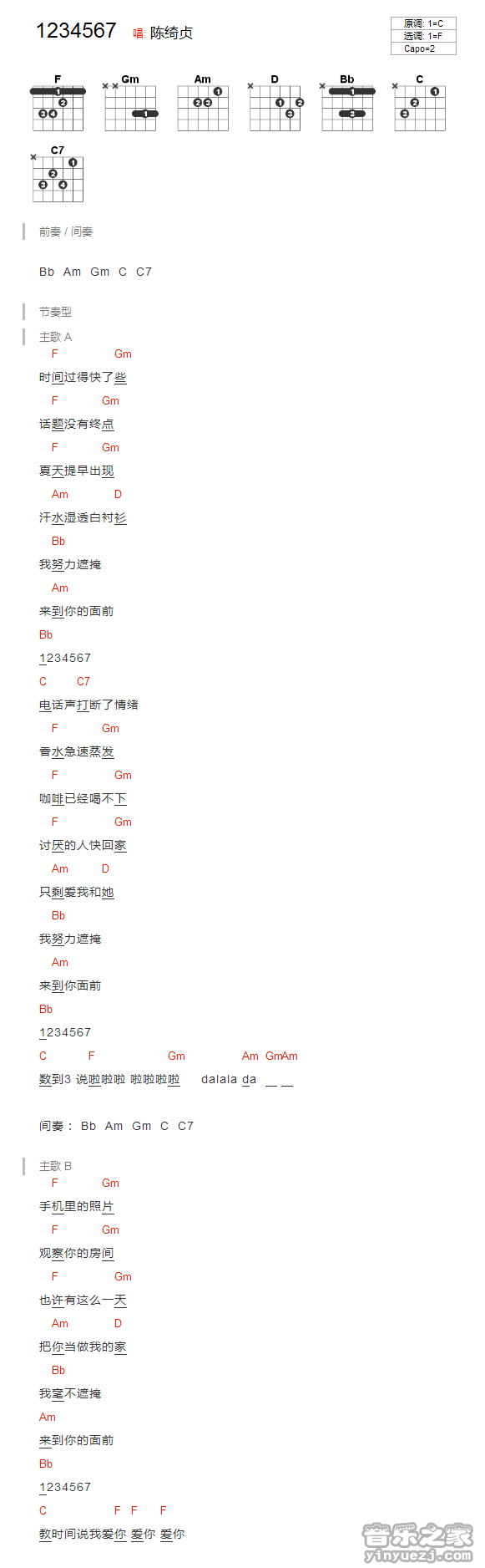 吉他陈绮贞《1234567》吉他谱_吉他弹唱谱_YYZJ编配