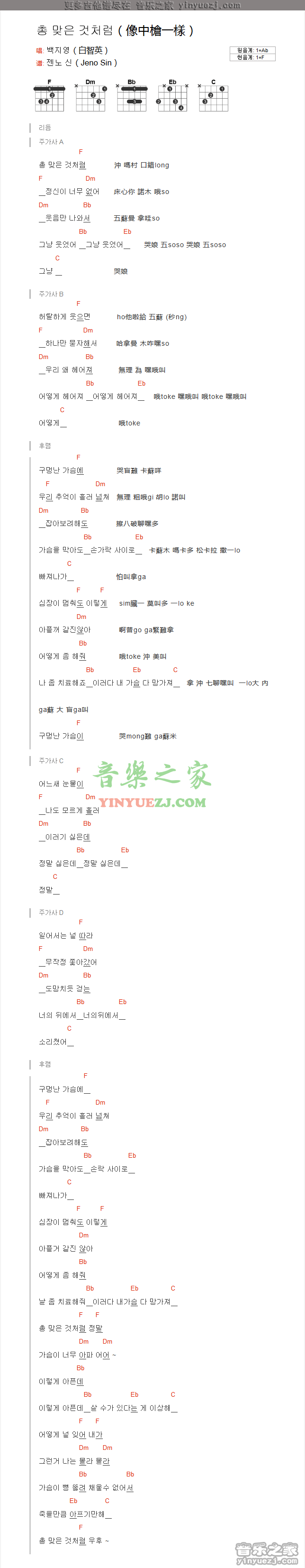 吉他黄致列/白智英《像中枪一样》吉他谱_吉他弹唱谱_YYZJ编配