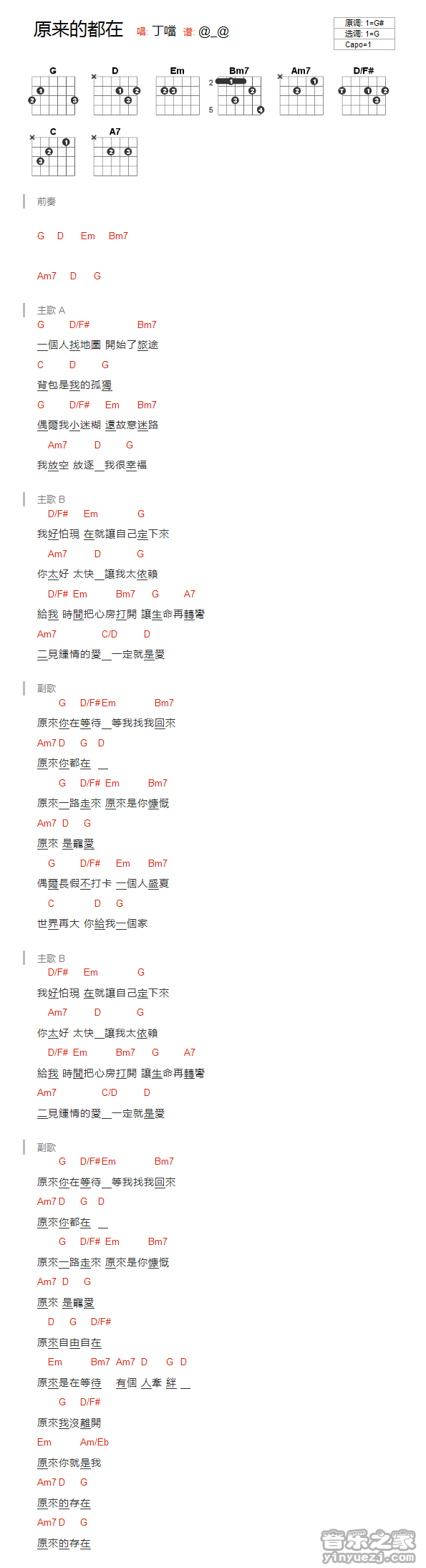 吉他丁当《原来你都在》吉他谱_吉他弹唱谱_YYZJ编配