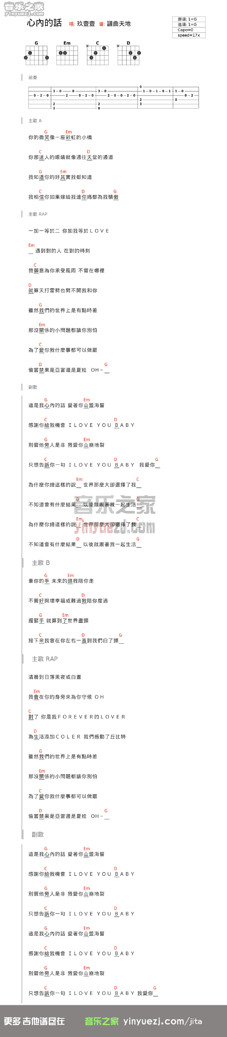 玖壹壹《心内的话》吉他谱,YYZJ编配出品,共有1张高清图谱,免翻页排版设计。...