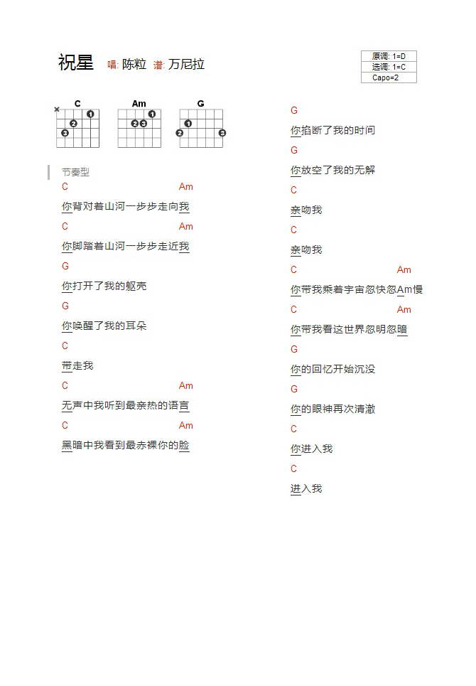 陈粒《祝星》吉他谱,YYZJ编配出品,共有1张高清图谱,免翻页排版设计。...