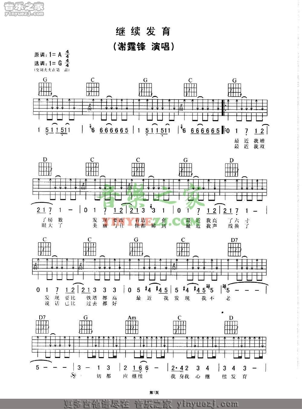 谢霆锋《继续发育》吉他谱,YYZJ编配出品,共有2张高清图谱,免翻页排版设计。...