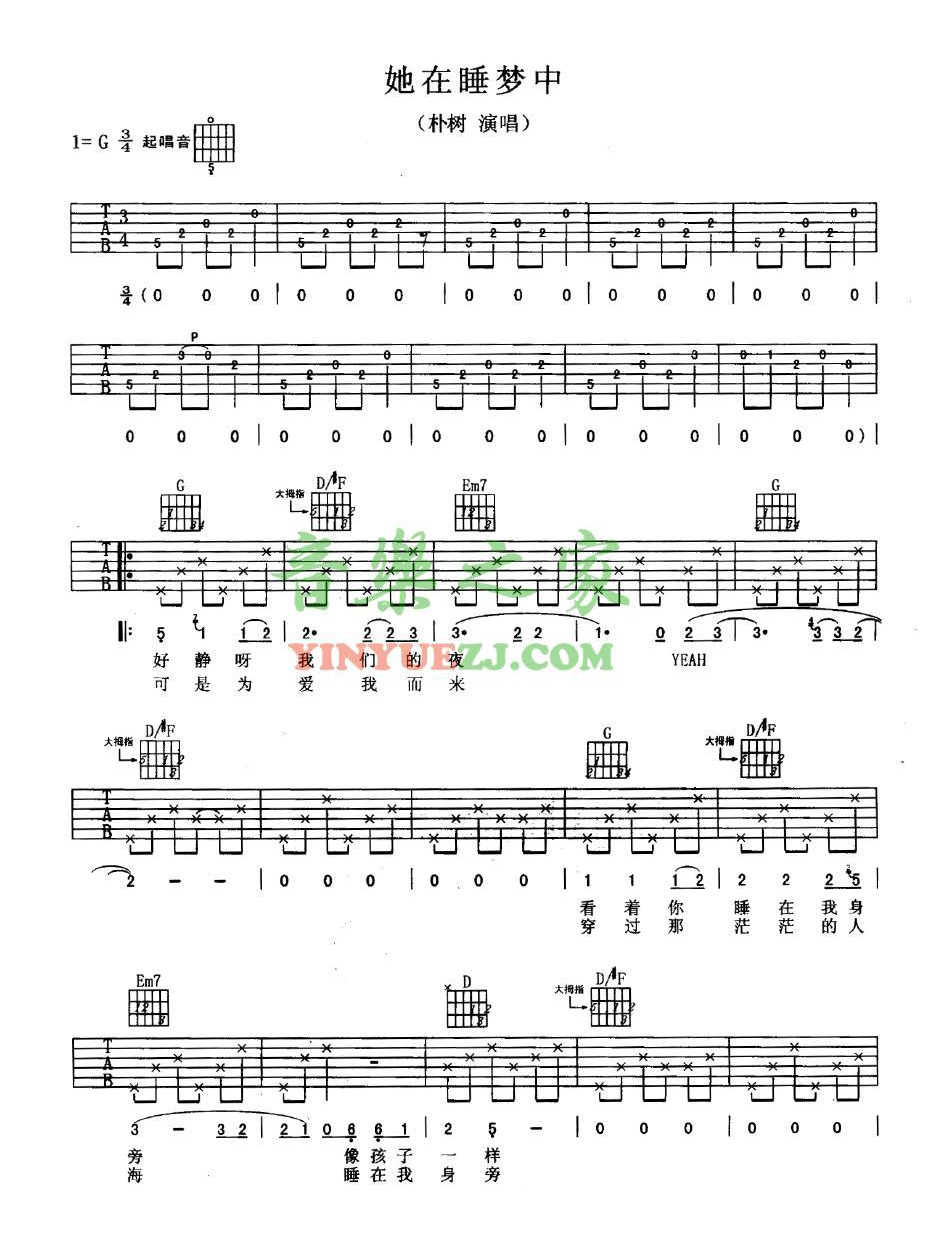 吉他朴树《她在睡梦中》吉他谱_吉他弹唱谱