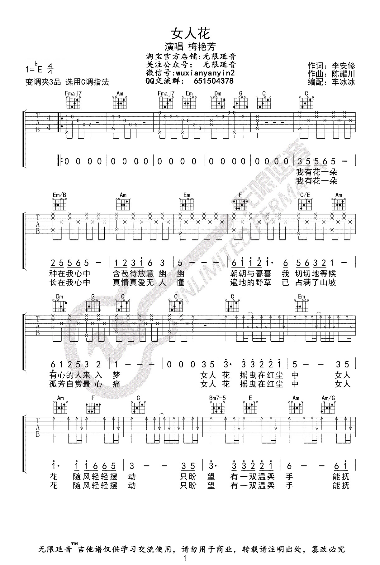 吉他梅艳芳《女人花》吉他谱_吉他弹唱谱_无限延音编配