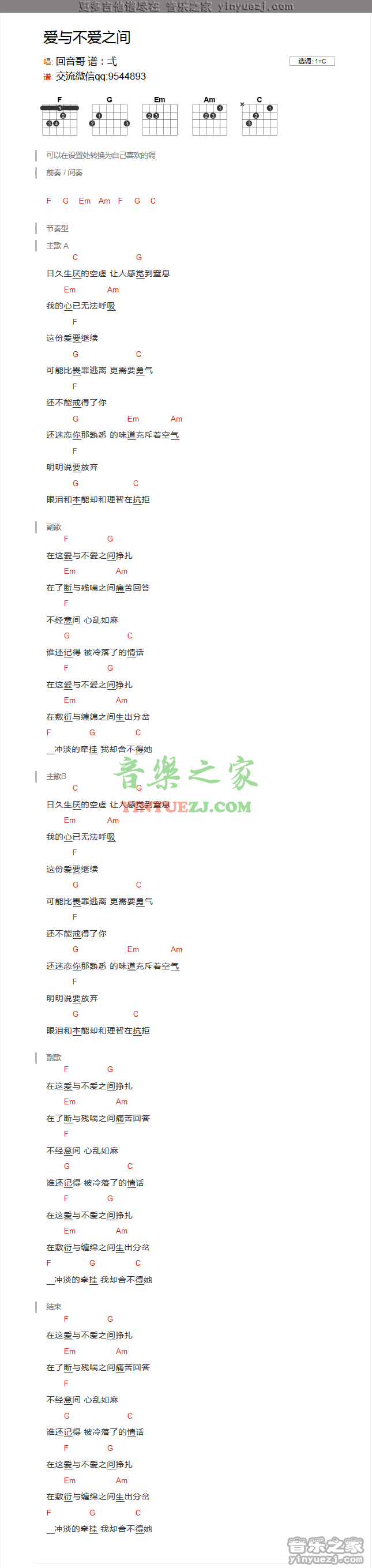 吉他回音哥《爱与不爱之间》吉他谱_吉他弹唱谱_YYZJ编配