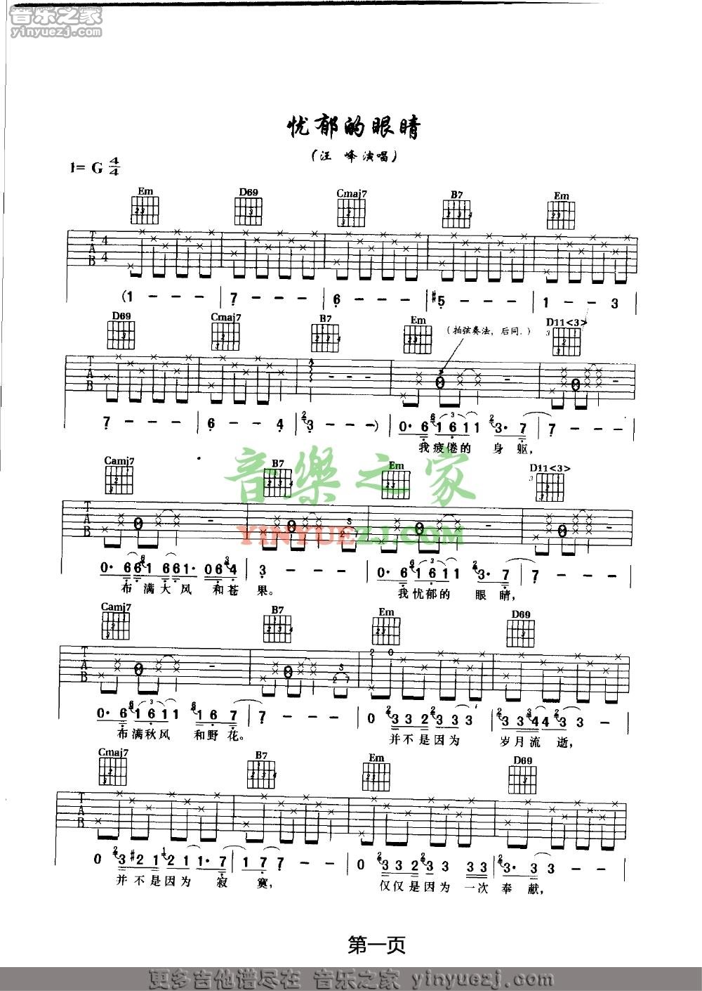 汪峰《忧郁的眼睛》吉他谱,YYZJ编配出品,共有3张高清图谱。...