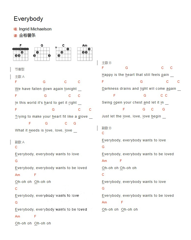 吉他Ingrid Michaelson 《everybody》吉他谱_吉他弹唱谱_YYZJ编配