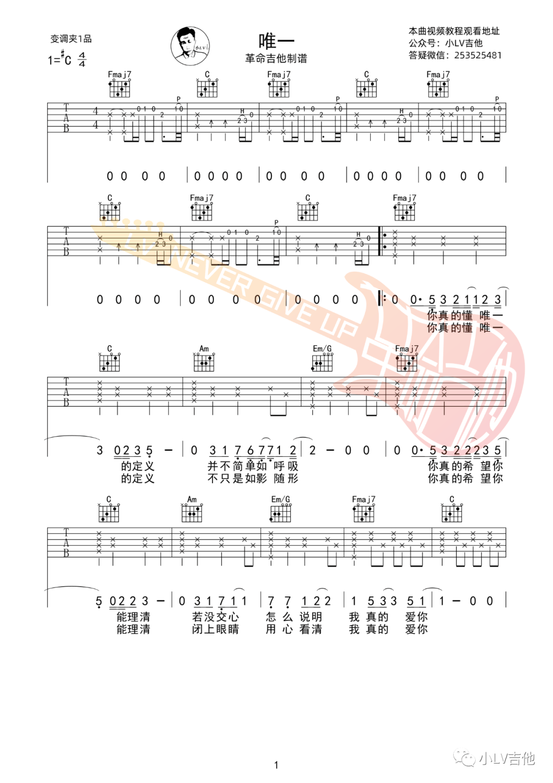 吉他告五人《唯一》吉他谱_吉他弹唱谱_革命吉他编配