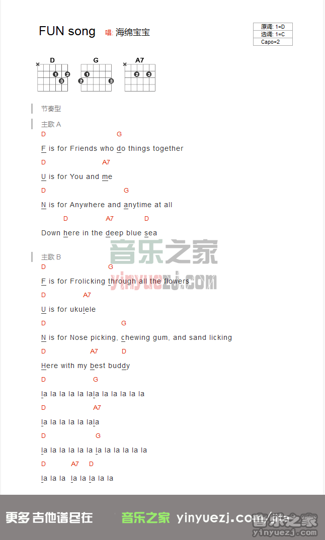 吉他海绵宝宝《fun song》吉他谱_吉他弹唱谱_YYZJ编配