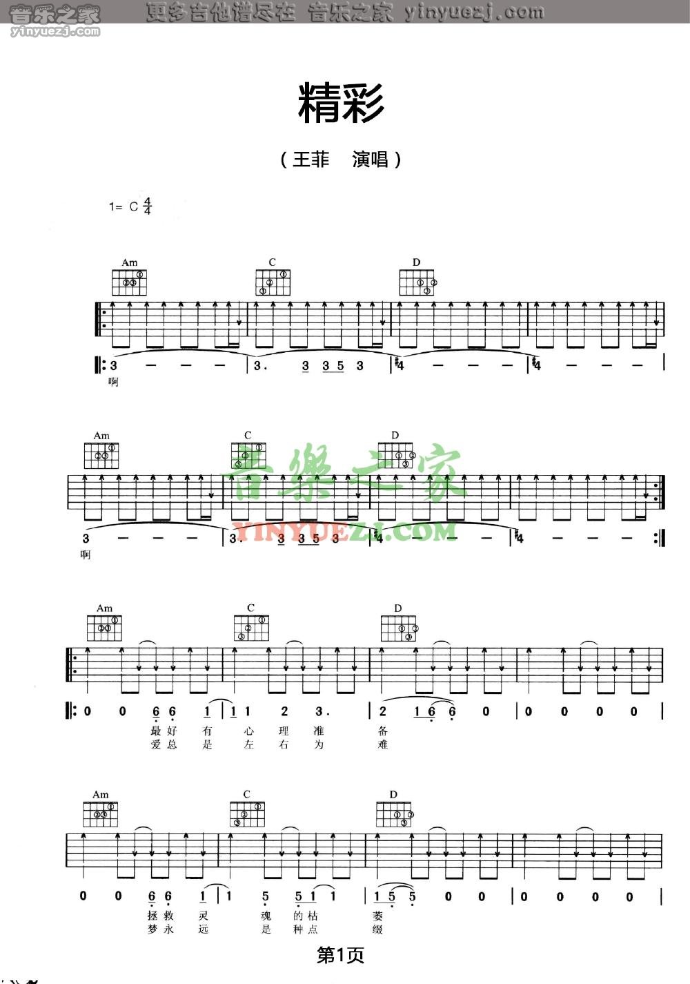 王菲《精彩》吉他谱,YYZJ编配出品,共有3张高清图谱。...