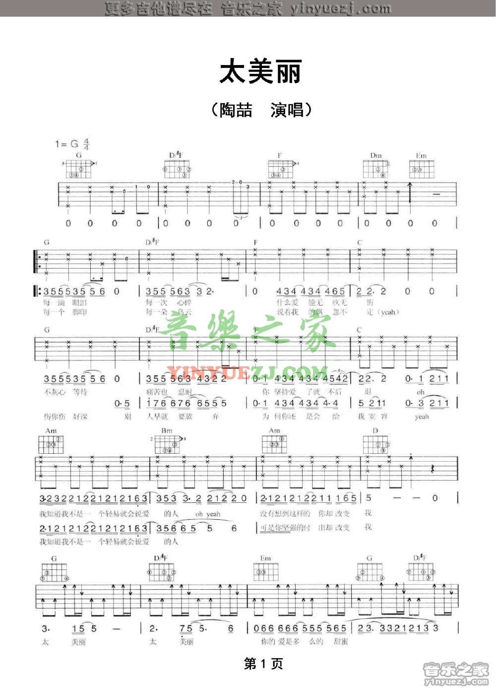 陶喆《太美丽》吉他谱,YYZJ编配出品,共有2张高清图谱,免翻页排版设计。...