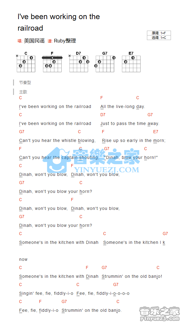 吉他美国民谣《I've been working on the railroad》吉他谱_吉他弹唱谱_YYZJ编配