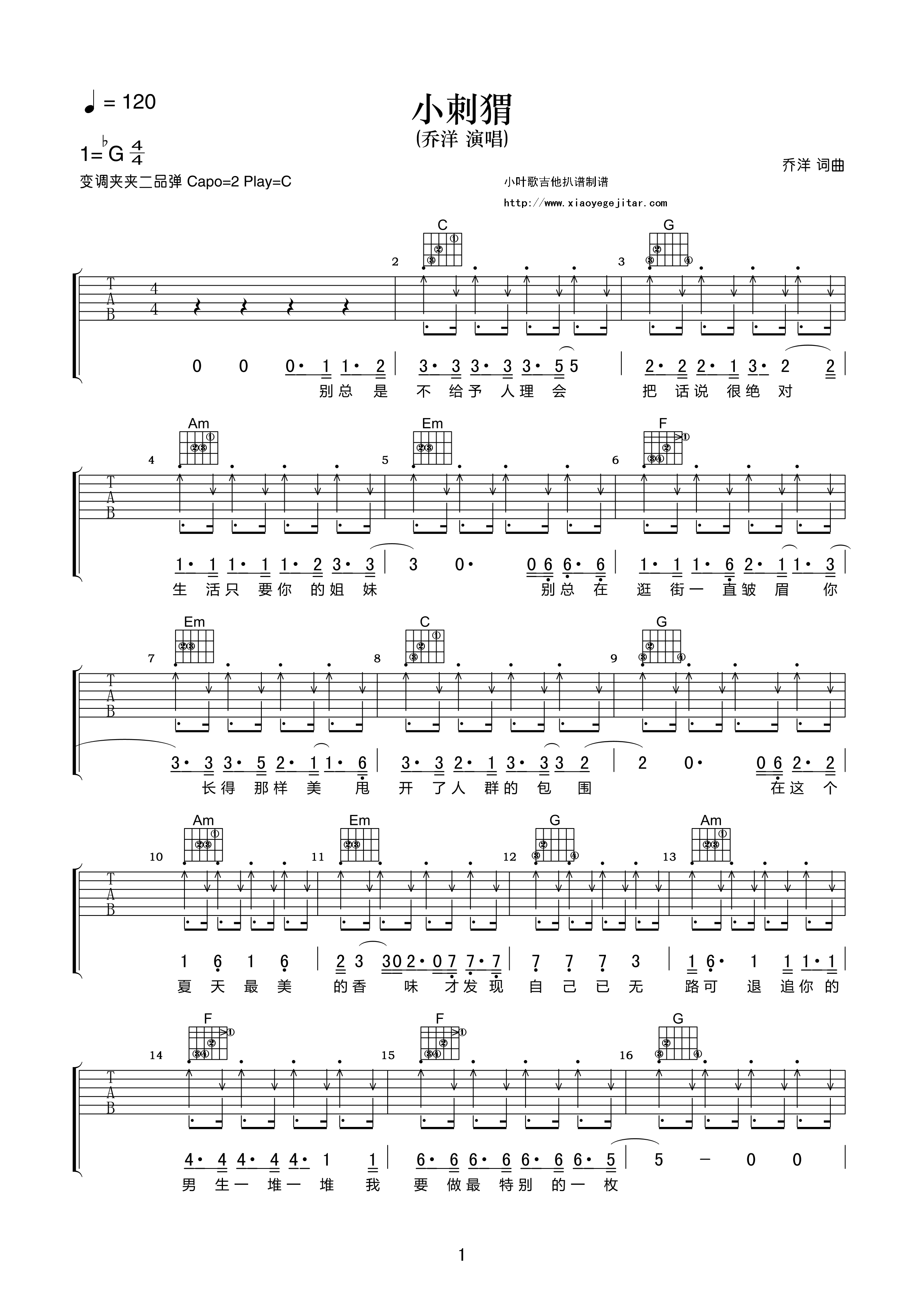 吉他乔洋《小刺猬》吉他谱_吉他弹唱谱_小叶歌编配