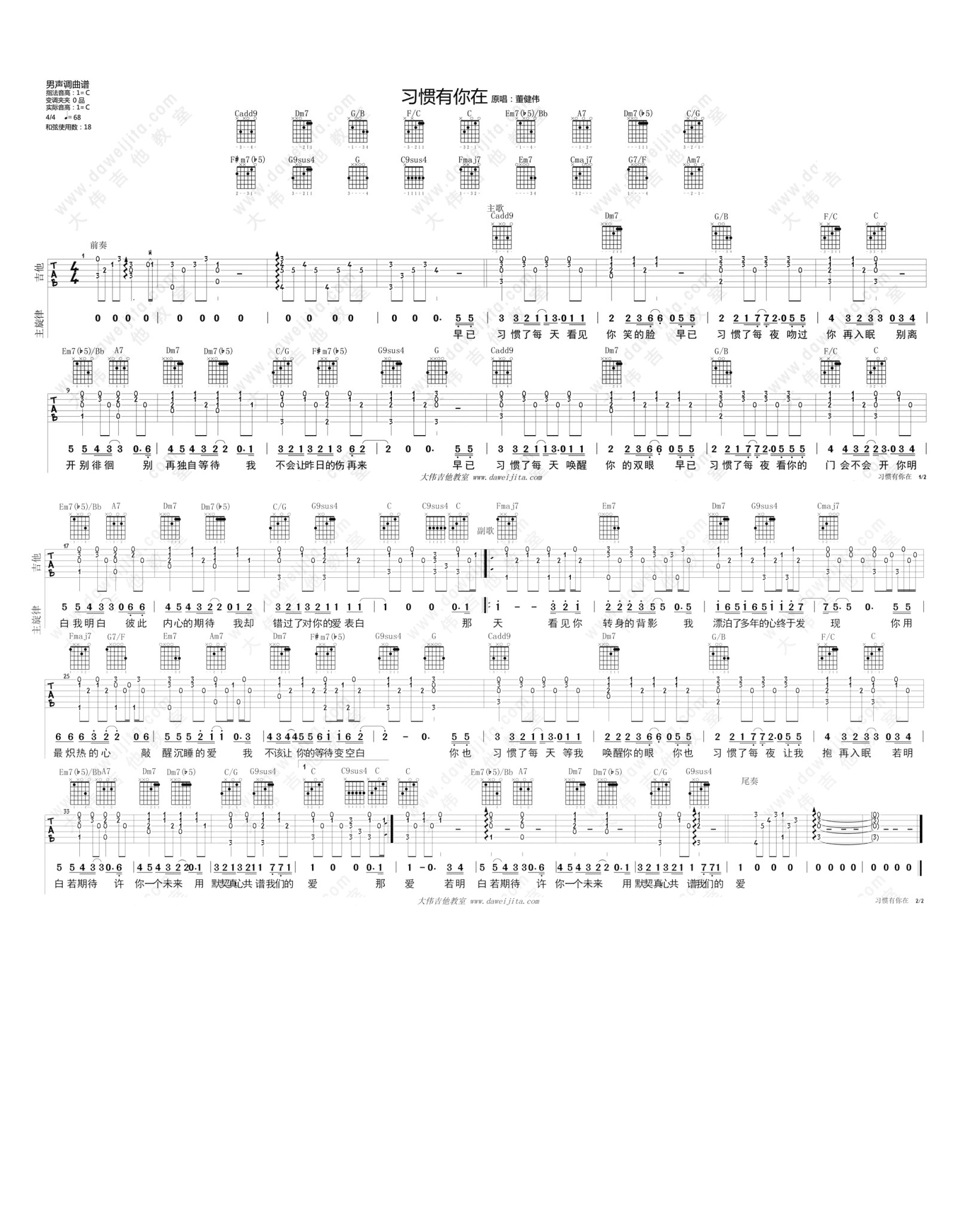 吉他董健伟《习惯有你在》吉他谱_吉他弹唱谱_大伟吉他编配